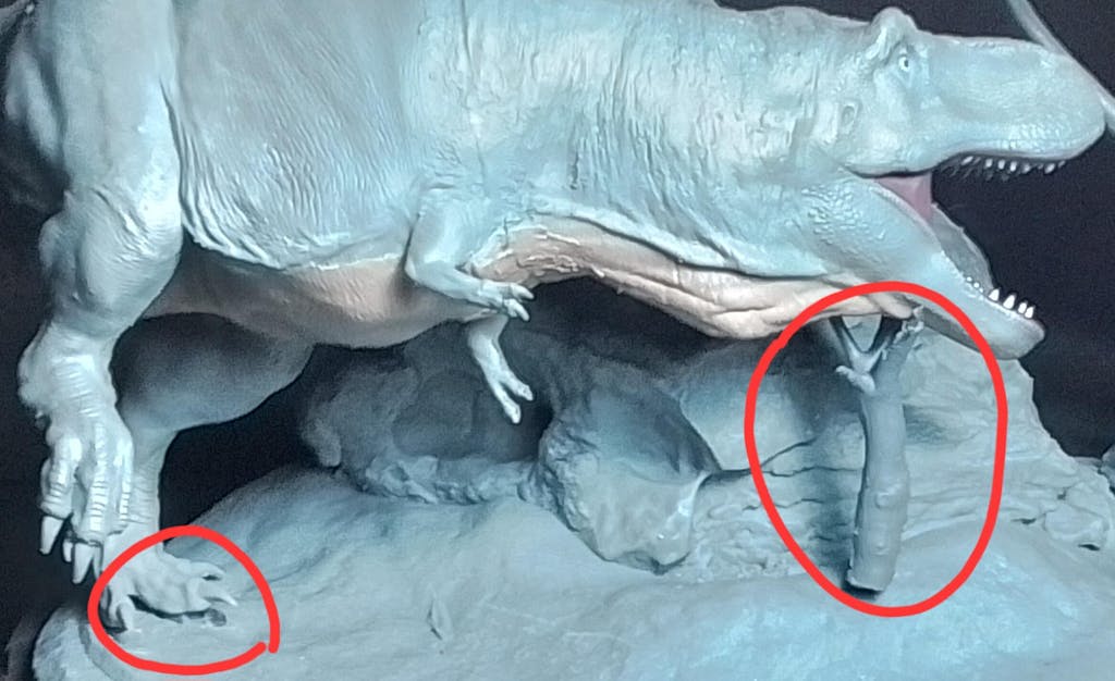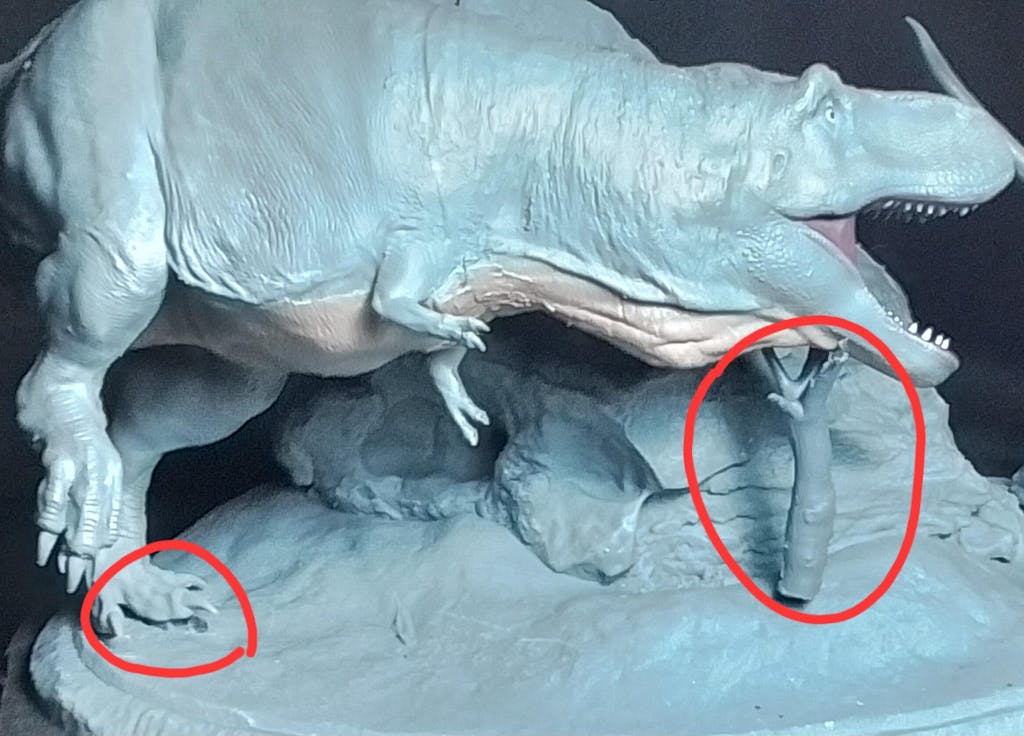 This is a great concept of a T-rex hunting down pachycephalosaurus however the T-rex doesn't stand properly on its own due to the balance and position of the model. The only solution is to glue it down permanently but personally I don't prefer to unless I have no other choice. I think the base should be heavier and the T-rex leg supporting the model fitted with a metal rod for a more steady balance. The pachycephalosaurus hands should be made not like its ready for an Olympic sprint as well. Overall this is a great model scene but more improvements can be done to make it even better.
